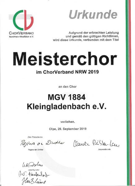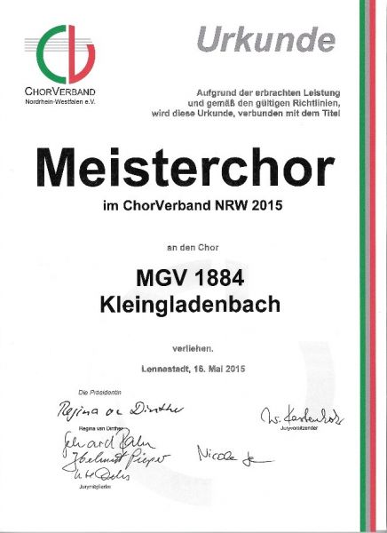 Nachdem wir uns entschlossen hatten, dem Sängerkreis Wittgenstein und damit dem Chorverband Nordrhein-Westfalen beizutreten, gelang es uns innerhalb kürzester Zeit und nach Absolvierung der Qualifikationsstufen „Leistungschor“ und Konzertchor“ im Jahr 2015 den Titel „Meisterchor“ zu erreichen, das höchste Prädikat, das ein Laienchor im Deutschen Chorverband erringen kann. Diesen Titel konnten wir 2019 bestätigen. Selbstredend streben wir eine Titelverteidigung in 2024 an.